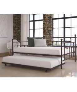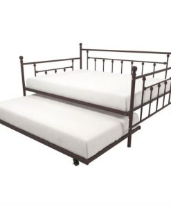 This Full size Bronze Metal Daybed with Twin Roll-out Trundle Bed blends form and function into one beautiful and practical package. This full-size daybed with twin-size trundle is perfect for a guest room, where its sophisticated Victorian style with spindles and finials are sure to make any décor a touch more elegant. The Full size Bronze Metal Daybed with Twin Roll-out Trundle Bed is perfect for a single guest or conversion to seating during the day, while the roll-out twin trundle allows for extra sleeping space and is even ideal for your children’s slumber parties. Both the daybed and trundle have sturdy slat-style bases with 20-22 slats and a center support, allowing you to set your mattress straight onto the bed – no box spring needed! The metal slats allow for increased air flow, keeping your mattresses fresh and helping to extend their lives.