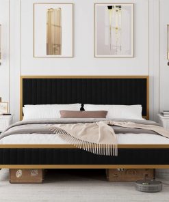 The headboard and footboard of this Full size Gold Metal Platform Bed Frame with Black Velvet Upholstered Headboard are designed with minimalistic yet classic vertical channel tufting and filled with high-quality sponge for exceptional coziness. A premium golden lacquered metal frame, seamlessly combined with luxurious velvet fabric, gives your bedroom a regal ambiance. No matter if your style is modern or vintage, it is the perfect choice to decorate your room. The platform bed features a heavy-duty steel frame and 11 thickened solid wood slats firmly attached with metal screws that can support up to 1000 lbs, making it more comfortable and supportive for your mattress without a box spring, thus saving your money. Provide a reliable foundation for a good night’s sleep (recommended mattress: 8″–14″). Extra-special silent strips are thoughtfully designed to reduce noise and strange squeaks between the slats and the bed frame. Plus, the soft padding under each metal leg effectively prevents your floor from being scratched and absorbs sound. This modern bed frame will bring you a quiet night. The bottom of the bed frame is 9.5” from the floor, so you can store some boxes, clothes, or shoes to keep your bedroom clean and tidy. The queen bed frame comes in a box that includes instructions and necessary tools, all pieces are labeled. Follow the clear instructions to assemble this beds within 20 minutes.