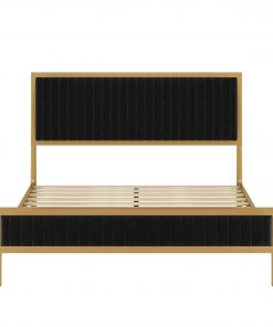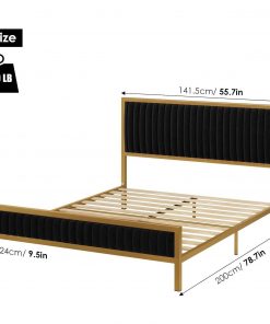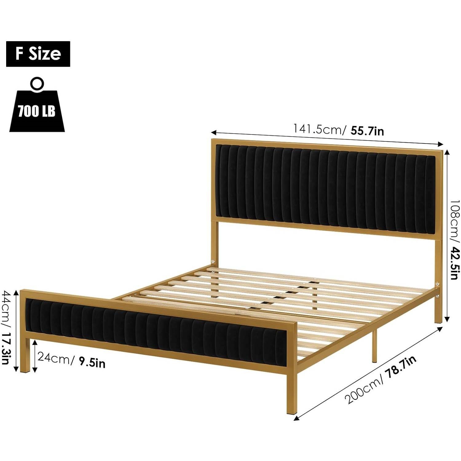 • Full size Gold Metal Platform Bed Frame with Black Velvet Upholstered Headboard