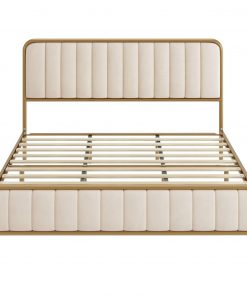 - Full size Gold Metal Platform Bed Frame with Off-White Upholstered Headboard