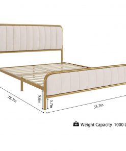 With a tufted headboard design and golden metal foundation, this Full size Gold Metal Platform Bed Frame with Off-White Upholstered Headboard will look classic in any bedroom. Perfect for modern bedrooms, the upholstered platform bed frame is not only stylish but functional as well. The soft-packed part of bed frames padded headboards are made of high-quality Velvet wrapped with high resilience sponge, perfect for sitting on this bed to read the books or playing an iPad. This is a comfortable height. 9.6 inches storage space beneath the bed frame, put some boxes or clothes or shoes for you, it can make room more tidy. The platform bed is made of a premium metal frame. 12 pcs strong wood slat support which provides firm, rigid support to your mattress. Ensures no shaky, squeaky and noise. Sturdy as well as pretty. Load Capacity up to 1000lbs. Everything you need for assembly comes zipped up in a compartment behind the headboard for convenience. No additional tools or parts are needed. Start to enjoy the fun of DIY according to the clear instructions. (PLEASE NOTE: MATTRESS SOLD SEPARATELY).