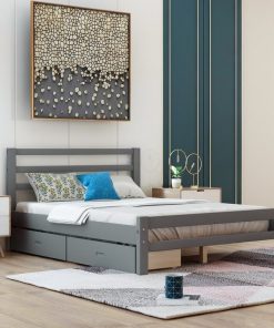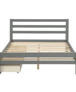 Get organized with the Full size Gray Low Profile 2 Drawer Storage Platform Bed, The bed comes complete with two underside pull out drawers. Strong, solid wood make up the frame and legs to support your favorite memory foam, latex, or spring mattress (mattress not included), and the simple yet stylish panel design of the headboard and footboard add subtle refinement to any room decor. The modern clean, straight line silhouette makes it easy for this piece to fit into any room; drawers can fit on either side of the platform bed.