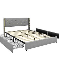 This Full Size Grey/Gold Linen Headboard 4 Drawer Storage Platform Bed is designed with 4 large drawers to accommodate your pillows, bed sheets, seasonal clothes and more. Crafted of high-density sponge and breathable linen fabric. The steel construction is sturdy enough to withstand a 660 lbs weight. With a tufted headboard, the bed frame looks very lavish and elegant, which definitely brings a sense of fashion to your bedroom. More, its installation is very simple. Each slat can be firmly installed by a hand pressing.