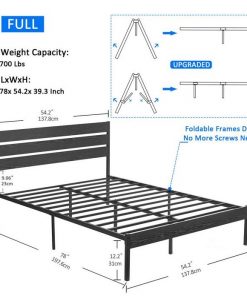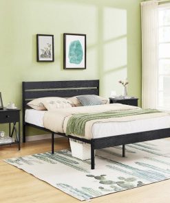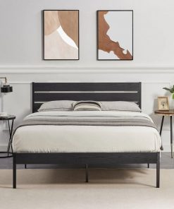 This Rustic Industrial Platform Bed Frame Wood Slatted Headboard and Footboard brings a modern silhouette and traditional industrial style into any room. Made from a blend of iron and engineered wood with a rustic black oak color palette for a lodge-worthy look. The distressed wood on the wide, rectangular headboard has simple, slatted accents for an open design in any space. Has 12.2 inches of underbed clearance to tuck away boxes, quilts, and storage bins. Plus, this bed includes a steel slat kit, so a box spring is not needed. Mattress sold separately, not included.