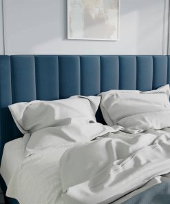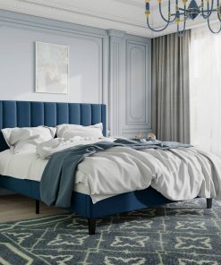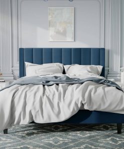 Upholstered in plush velvet, our luxurious bed is the best choice for your classy life. This Full size Modern Navy Blue Velvet Upholstered Platform Bed with Headboard also can seriously upgrade your rooms aesthetic. A sturdy steel frame and durable wooden slats offer pretty stability and durability. There are feet on the headboard post and all feet are required to be attached to the frame. Do not use highly corrosive solutions when cleaning the product.