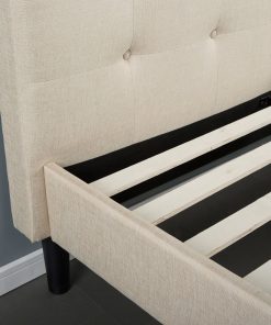 This Full size Platform Bed Frame with Taupe Button Tufted Upholstered Headboard will transform your bedroom. It ships in one carton with the frame, legs and wooden slats conveniently located in the zippered compartment in the back of the headboard for easy assembly. This contemporary upholstered full platform bed features a button tufted headboard and low profile footboard style frame, with wood slats and exposed feet for support. The taupe upholstery looks luxurious and this platform bed makes an excellent addition to any bedroom.