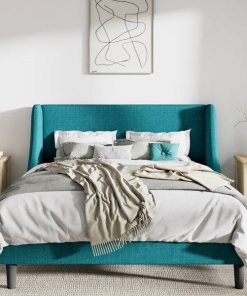 Full Size Turquoise Linen Blend Upholstered Platform Bed with Wingback Headboard