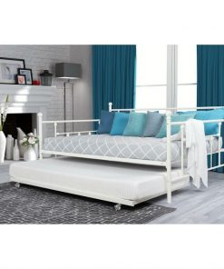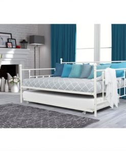 Add modern style and beauty to your home with this Full size White Metal Daybed with Twin Roll-out Trundle Bed. Crafted from metal and finished in classic white, this daybed features clean lines and a simple elegance which complements almost any decor. Able to be used as a bed or couch, this daybed is perfect for offices and living areas which can then be turned into guest rooms whenever needed. Its included roll-out trundle also allows the daybed to sleep two people so you never have to worry about having enough sleeping space.