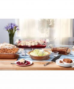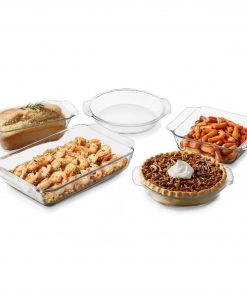 The Glass 5-Piece Bakeware Oven Safe Casserole Baking Dish Set – Dishwasher Safe provides 2 bake dishes, a loaf dish, and 2 pie plates. Watch from all sides as your food heats evenly and then grip the premium handles to serve directly from the attractive vessels. Store leftovers in the same dishes later. Extremely durable and dishwasher safe for quick, easy cleanup; to help preserve your glassware and please refer to general glass handling guidelines. Clear glass lets you monitor baking, serve your creation in style and see inside while stored.