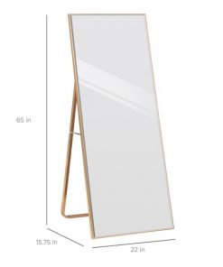 Customize your wall space by placing the mirror horizontally for a wide view, or set it up vertically to get a longer glimpse of yourself with this Gold Full Length Leaning Wall Hanging Mirror. Designed with hook holes on each side of the frame, as well as a hinged fold-out support stand, this mirror provides multiple setup options and includes all necessary hardware; easily hang it or stand it up. Mirror’s edges are smoothly cut and polished to a specific angle and size, giving the mirror an elegant touch that adds a piece of charm to any room. This mirror is durably crafted with aluminum alloy and a thin, aluminum frame for a lightweight design that makes it easy to take to any room.