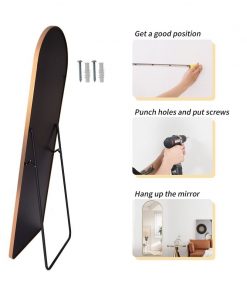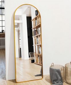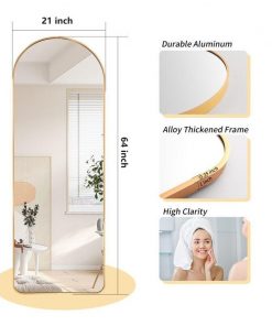 This Gold Large Full Length Rounded Leaning Wall or Hanging Mirror is made up of aluminum alloy and float glass. The rounded corner design is safer and protects against scratches. The elegant arc design makes it more unique than traditional mirrors. HD float glass design with clear reflection without distortion. The mirror is perfect for reflecting both natural and artificial light to brighten your house. an be placed anywhere in your room or leaned against the wall. It can also be hung vertically and horizontally.