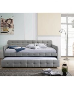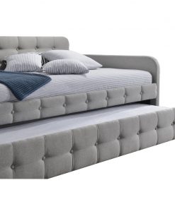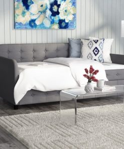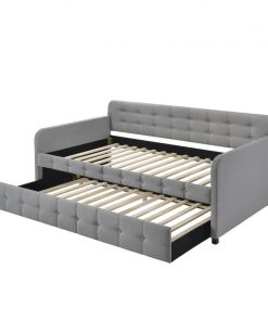 A traditional design gets a contemporary update in this transitional Grey Tufted Polyester Linen Twin Daybed with Trundle. Founded on a solid wedge, rubberwood, and manufactured wood frame, this daybed features a full back and track arms. Enveloped in 100% polyester, this daybed features button tufting and detail stitching for a tailored touch. A series of slats accommodates your preferred mattress (not included), while a rollout trundle rounds out the design. Measuring 36″ H x 82″ W x 43″ D overall, this daybed has a 300 lbs. weight capacity.