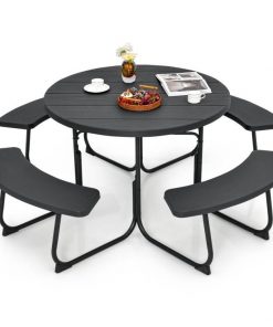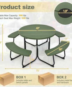 The 43″ round table Green All Weather 8 Seater Picnic Table Umbrella Hole can comfortably seat up to 8 adults. Whether you’re hosting a barbecue or enjoying an outdoor meal, the picnic table provides the perfect gathering place for your family and friends. The selected HDPE material exhibits excellent resistance to cracking and fading, ensuring its durability and making it a dependable choice for long-lasting outdoor use. The picnic table bench set is supported by a powder-coated metal frame and has excellent rust resistance and stability. The u-shaped legs and reinforced x-structure provide reliable support. Besides, there exist non-slip protectors to avoid scratching to the floor. Featuring a 1.9″ hole, the round picnic table set allows you to install a patio umbrella. Hence, you can create a shaded area to enjoy a delightful meal without harsh sunshine. With the wood-like appearance and enhanced durability, the outdoor picnic table blends seamlessly with any outdoor setting, such as your yard, lawn, poolside, or garden.