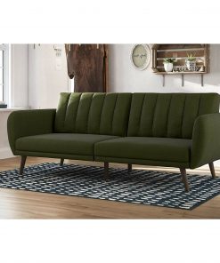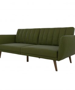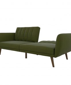 Be embraced by the comfortable cushioning of this Green Linen Upholstered Futon Sofa Bed with Mid-Century Style Wooden Legs. With its ribbed tufted cushioned back, the Green Linen Upholstered Futon Sofa Bed with Mid-Century Style Wooden Legs gives your body all the support you need to sit and relax for hours. The combination of curved armrests and slanted legs work together to provide a unique rounded look that stands out. The linen upholstery adds another element of elegance making this a perfect statement piece for any living space.