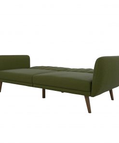 - Green Linen Upholstered Futon Sofa Bed with Mid-Century Style Wooden Legs