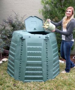 Weather you’re composting for big groups, large properties, or shared housing, look no further than the Recycled Plastic 267 Gallon Compost Bin Green. This jumbo-sized compost bin features a ceramic coating, a large dual lid, and two large removal doors. It snaps easily into place for quick assembly, and has the capacity for high-volume compost production. Toss in kitchen and yard waste and watch as time does all the work. This compost bin can also be stirred with a composting tool. The dark green bin is made from 100% recycled materials.