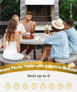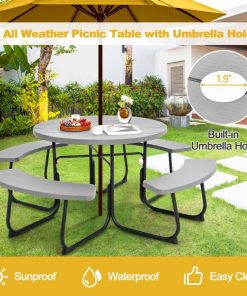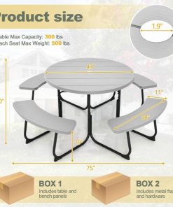 The 43″ round table Grey All Weather 8 Seater Picnic Table Umbrella Hole can comfortably seat up to 8 adults. Whether you’re hosting a barbecue or enjoying an outdoor meal, the picnic table provides the perfect gathering place for your family and friends. The selected HDPE material exhibits excellent resistance to cracking and fading, ensuring its durability and making it a dependable choice for long-lasting outdoor use. The picnic table bench set is supported by a powder-coated metal frame and has excellent rust resistance and stability. The u-shaped legs and reinforced x-structure provide reliable support. Besides, there exist non-slip protectors to avoid scratching to the floor. Featuring a 1.9″ hole, the round picnic table set allows you to install a patio umbrella. Hence, you can create a shaded area to enjoy a delightful meal without harsh sunshine. With the wood-like appearance and enhanced durability, the outdoor picnic table blends seamlessly with any outdoor setting, such as your yard, lawn, poolside, or garden.