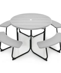 The 43″ round table Grey All Weather 8 Seater Picnic Table Umbrella Hole can comfortably seat up to 8 adults. Whether you’re hosting a barbecue or enjoying an outdoor meal, the picnic table provides the perfect gathering place for your family and friends. The selected HDPE material exhibits excellent resistance to cracking and fading, ensuring its durability and making it a dependable choice for long-lasting outdoor use. The picnic table bench set is supported by a powder-coated metal frame and has excellent rust resistance and stability. The u-shaped legs and reinforced x-structure provide reliable support. Besides, there exist non-slip protectors to avoid scratching to the floor. Featuring a 1.9″ hole, the round picnic table set allows you to install a patio umbrella. Hence, you can create a shaded area to enjoy a delightful meal without harsh sunshine. With the wood-like appearance and enhanced durability, the outdoor picnic table blends seamlessly with any outdoor setting, such as your yard, lawn, poolside, or garden.