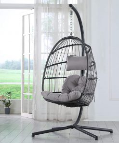 Relax in style with this Modern Grey Indoor/Outdoor Wicker Rattan Aluminum Frame Swing Egg Chair Hammock. The hanging egg chair includes one egg hammock chair, one hook, one stand, one cushion, one pillow, and an accessories tool bag. This hammock chair with stand can be folded and stand frame is simple to fix together with the included tools and accessories. Great for indoor or outdoor use.