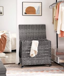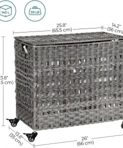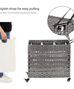 Has the overflow of laundry found its way into the middle of the room? Its time to offer them a home with this Grey PP Rattan 3-Basket Laundry Hamper Sorter Cart with Removable Cotton Bags, which is handwoven in rattan style and will surely spice up your space. With this laundry sorter, you can sort your laundry by color or material before washing; there are 3 laundry bags available so you can keep your red socks from accidentally turning your clean, white shirt into pink. 3 bags are separate, removable, and with handlesnow you dont have to take everything out when you only want to wash the darks; just grab the bag of dark clothes and shake it all out into the washer. With 4 wheels and a stylish synthetic leather strap, even your kid can help roll or pull a weeks worth of laundry to the washer; 2 brakes allow you to lock it in place. A durable Laundry Basket with Wheels supported by a metal frame, 3 separate inner bags, foldable design, and easy assembly that can be done in minutes. It’s easy to toss your dirty clothes onto the chair or floor. But before you feel unhappy in a messy room and spend more time gathering them up, why not try this laundry basket with 3 compartments? The chaos is hidden under the lid, and even better, you can finish the sorting while tossing.