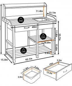 This Grey Wood Outdoor Garden Potting Bench Storage Shelf with Removeable Sink is sure to bring out the inner gardener in you. Plus, your back and knees will enjoy the break from kneeling and bending over. It is made of solid wood and is appropriate for outdoor use. There are two shelves, each with a slatted floor, which allow proper draining when you water your potted plants. The roomy surface area incorporates a stainless steel sink and is roomy enough for you to nurture seedlings and trim mature growth. Stash packets of seeds in the single drawer and hang your tools, gloves, and apron on the three pre-attached hooks. Organize The Place: Collect all your gardening tools in one place so that the garden can look organized. The added shelves and drawers of the potting bench provide more places to store your tools. Hooks Included: The potting table has 3 pre-attached hooks on the side, and every hook has two places to hang your garden tools. They can free up more space for your potting bench. Stainless Steel Sink: Update the sink, made of stainless steel, to make the sink more sturdy and durable. Release Your Back And Legs: You can do your garden work on the garden table rather than work squatted, which makes your garden work easy.