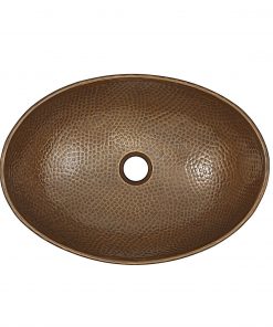 Design your dream bathroom retreat around this Hammered Copper Bath Vessel Sink Oval 19 x 14 inch. The new and improved design of this vessel sink reduces splashing and keeps water where it belongs. Unique and Innovative this copper bath sink makes a luxurious statement in any bathroom. Handmade from 18 gauge pure solid copper the Confucius is hand finished in our most popular Antique copper finish. Easy to maintain, affordable and protected by a Lifetime Warranty.