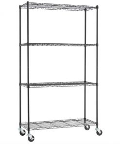 This Heavy Duty Black Steel 4-Tier Shelving Unit with Locking Casters is perfect for any business, home, garage, or kitchen use. With a 250 lb weight capacity per shelf on feet levelers, it can hold your large, heavy boxes, big items, and everything in between. Assembly requires no tools and uses a slip-sleeve locking system allowing shelves to be adjustable in 1″ increments.