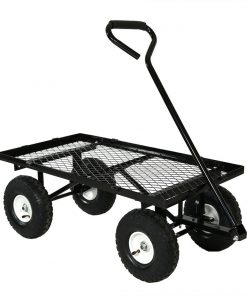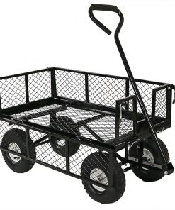 With a 660-pound hauling capacity, the options are endless when it comes to moving large items with this Heavy Duty Black Wheelbarrow Steel Log Garden Cart. The multi-use wagon sides can be folded down or completely removed by pulling out the side pins, creating a useful flatbed cart. The convenient u-shaped quick-release hook located on the bottom of the frame makes unloading a quick and effortless process. The 70″ collapsible wagon is made from durable steel mesh materials with a powder-coated finish making this product weather-resistant and long-lasting. The large D-shaped padded handle allows the utility cart to be towed or pulled by hand.
