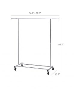 Assembling a clothes rack has never been easier; it takes only 3 stepsunfold, snap parts together, and its ready to embrace your clothes; also, you can fold it flat for transport with the same ease. If you think this Heavy Duty Chrome Plated Silver Metal Garment Rack Clothes Hanging Bar on Wheels looks no different from others, look again. Instead of common connected parts, the top hanging bar is a single, jointless rod, which makes it even stronger and holds up to 200 lb. Fill it, move it, lock it in place. With 4 quality wheels, you can easily glide this rolling closet in front of the mirror and lock it in place as you get ready for a night out. The thing is, you want more hanging space but have a small space; let this extendable clothing rack be your lifesaverkeep the length at 36.2 (min.) to fit in a small area, or extend it to 52 (max.) to get more space as needed.