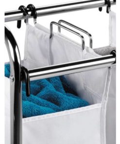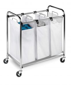 This Heavy Duty Commercial Grade Laundry Sorter Hamper Cart in White Chrome is a Sorter/Hamper, Chrome. Commercial-grade triple laundry sorter combines sleek design and sturdy heavy-duty construction. Rust-resistant chrome-plated steel frame; high-traction, lockable rubber casters. 3 removable white poly-cotton sorting bins with metal handles for easy lifting. Lifetime limited warranty. Measures approximately 31-inches wide by 16-inches deep by 33-inches high.