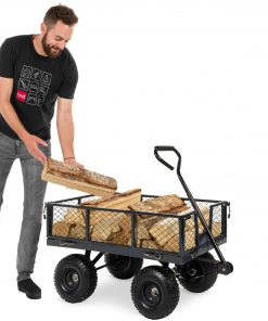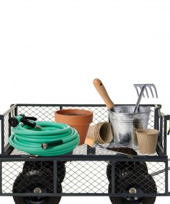This Heavy Duty Gray Steel Garden Utility Cart Wagon with Removable Sides simplifies the process of moving supplies that weigh up to 400 lbs. from one location to another. Can be used for gardening, warehouse jobs, or chores around the house. The four (10) convenient rubber wheels and front steering axle allow you to steer the cart in various types of terrain with the cushioned grip handle. Convert this cart into a flatbed, to move heavier objects, by removing the foldable sides with the quick release hinges. The steel construction frame keeps this cart durable and able to be used time and time again. Its powder-coated mesh bed retains the appeal and functionality of the cart with its corrosion resistant design. For a multi-purpose cart that will get any moving job done, purchase this heavy duty garden cart