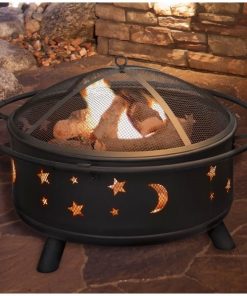 This Heavy Duty Steel Metal Wood Burning Fire Pit with Moon and Stars Cutouts is the perfect addition to any backyard patio or deck. The fire pit features star and moon cutouts throughout that make for a stunning effect at night when there is a fire going. Sturdy construction with a large fire bowl. The powder-coated steel frame resists rusting. Features a spark screen and protective screening across the cutouts to prevent sparks from flying. A safety ring encompasses the entire diameter of the fire pit and functions as a convenient handle for carrying. Includes spark screen, log poker, log grate, and a weather resistant cover so you have everything you need.