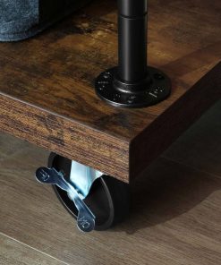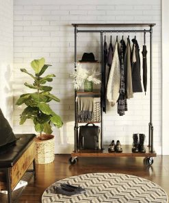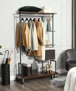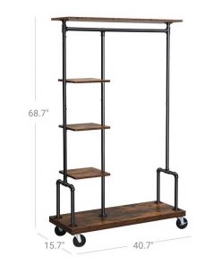 This Industrial Metal Pipe Garment Rack with Wood Storage Shelves on Wheels has industrial metal pipes paired with rustic engineered woodits a pair that defines a room and this clothing rack, compelling eyes to look its way as it shows off your clothes in style, giving them a one-of-a-kind stage to shine on. Forget about sagging plastic or wooden railsthis welded iron pipe rail holds up to 132.3 lb, giving your designer clothes and thrift finds deserved support; each shelf on this clothing rack is made of reliable engineered wood. Speaking of shelves, dont you need a space for your shoe collection, purses, and boxes? With the 3 side shelves, a top shelf, and a bottom shelf, you have 5 spots to fill to the brim on this garment rack for clothes. Roll your clothing collection from the closet to the bedroom, living room, and beyond with the 4 wheels; 2 are lockable and keep this clothes rack in place while you try on outfits.