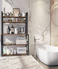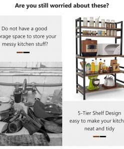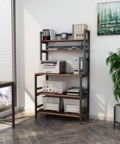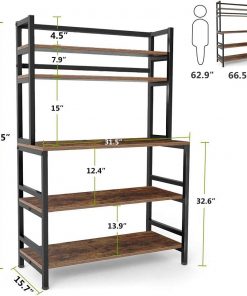 This Industrial Modern Kitchen Bakers Rack Brown Woodgrain Sturdy Metal Frame has high on utility, not only a kitchen island, also as an elegant bookcase, microwave stand, spice rack organizer, bathroom cabinet, wine board for living room, and can harmonize with any other rustic furniture in any room. The vertical structures doesnt take up space and add more storage space for bedroom, kitchen, pantry or bathroom. Come with a total of 3 bottom shelves and 2 top shelves, this microwave rack is an excellent storage option for the eat-in kitchen. It is ideal for holding a microwave, oven, and some of your other kitchenware or bits and pieces, as well as storing spice, plate dishes, and any other things you want. Your kitchen will become tidy! This kitchen stand features a 31.5L x 15.7D tabletop to provide a sturdy working surface, which is durable and easy to clean. Two slatted upper shelves are ideal for displaying your favorite cookbooks, jars of spices, and canisters of dry goods. A strong iron frame and quality 0.59 thick chipboard enhance the strength, so you can put all you need on this baker rack. 6 reinforced iron rods of each tier prevent items from slipping and increase the loading capacity. Floor levelers not only can be used in uneven ground to prevent scratches, but also make adjustment of height to meet your various demands.