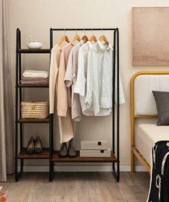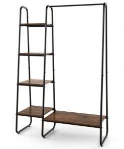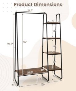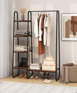 This Industrial Wood Metal Garment Rack Clothes Hanging Bar with Storage Shelves would be a great addition to your home. Reasonable Storage Solution: Coming with 1 large shelf and 4 small ones, you can store plenty of your bags, shoes, boxes, and accessories without congestion. The clothes rack also has a hanging rod to accommodate long garments and clothes that wrinkle easily. It not only makes your room tidy but also you can take things conveniently. Sturdy and Durable Materials: The frame of this storage garment rack is made of heavy-duty metal pipes and the layer board is made of premium MDF material. The painting process ensures that the surface of the clothes rack is smooth and not easy to rust easily. Tight welding between metal pipes and board ensures long service life. Free Standing Rack for Stability: This garment rack is designed in a triangle frame that provides extra stability and steadiness. The rack can stand freely on the ground without wobble and collapse. You can place this garment rack against the wall, or you can put it anywhere you want. Multifunctional Storage Rack: This storage organizer is designed in a compact and concise appearance and can be placed in the corner of your home, making small rooms more functional. What’s more, the organizer can be used in different places such as living rooms, bedrooms, clothing shops, walk-in closets, and more. Easy to Assemble and Clean: It is simple to install these clothes rack with a detailed installation manual and required accessories in a short time. With a smooth and waterproof surface, it is convenient for you to clean the rack with wet cloth in everyday life.