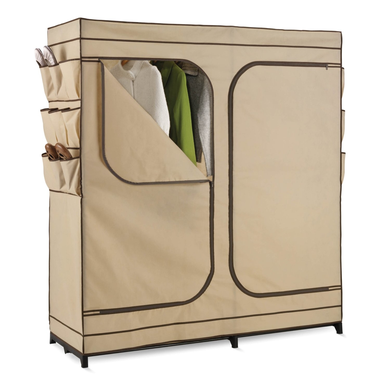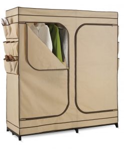 The granddaddy of all economy storage closets, this Khaki Double Door Wardrobe Portable Clothes Closet with Shoe Storage measures a generous 60-inches wide and works great for extra hanging space or seasonal storage. The high-capacity steel rod will hold all of your dresses, shirts, pants and other items giving you an excuse to shop for more! The breathable, lightweight fabric completely surrounds your garments, protecting them from dust and debris, and offers the convenience of two D-Style zipper doors for easy access. Integrated 9-pocket exterior storage is perfect for sandals and accessories.