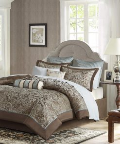 Give your mattress a magnificent makeover with this King 12 Piece Cotton Polyester Comforter Set Blue Paisley! Set includes 1 Comforter, 2 Decorative Pillows, 2 Euro Shams, 2 King Shams, 1 Bed skirt, 1 Flat Sheet, 1 Fitted Sheet, and 2 Pillowcases. Has a silky feel and is made from Polyester & Cotton. Set is in Eastern King (standard king) size and ships via FedEx Ground.