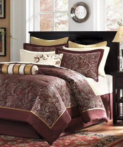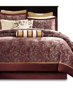 Give your mattress a magnificent makeover with this King 12 Piece Cotton Polyester Comforter Set Red Gold Paisley! Set includes 1 Comforter, 2 Decorative Pillows, 2 Euro Shams, 2 King Shams, 1 Bed skirt, 1 Flat Sheet, 1 Fitted Sheet, and 2 Pillowcases. Has a silky feel and is made from Polyester & Cotton. Set is in Eastern King (standard king) size and ships via FedEx Ground.