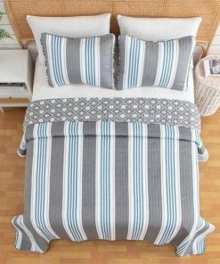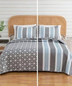 You can’t go wrong with this King Size 3 Piece Coastal Grey/Blue Nautical Quilt Set. Looking for a simple and tasteful coastal quilt for your beach-themed bedroom? The primary side of the quilt features simple blue and grey striping, while the reverse features a pattern design accompanied by starfish, sand dollars, and fish. The blue color ties in the coastal feel, while the grey neutralizes the quilt. Enjoy this super comfortable quilt in any bedroom.