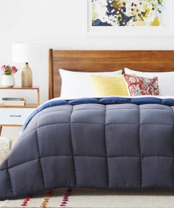 Perfect for curling up and staying warm this King Size All Seasons Plush Grey/Navy Reversible Polyester Down Alternative Comforter provides everything and more all year round! This piece features baffle box stitch construction for a classic look that doubles as a handy way to keep the filling from sliding and lends this piece a breathable touch. This mid weight 275 gsm comforter has 4 corner tabs to keep your duvet in place and since it’s machine washable, a quick cycle is all it takes to have this piece looking its best.