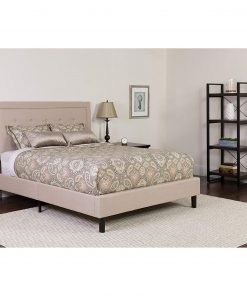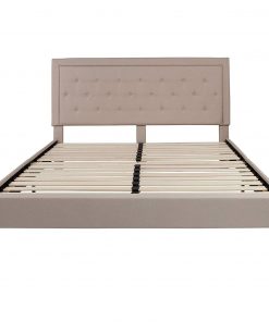 Retreat in style with this King Beige Upholstered Platform Bed Frame with Button Tufted Headboard. Platform beds are designed to give your room an open concept feel and are perfect for those who don’t like high seated beds. One advantage is the soft panel headboard as well as the cushion like base. The headboard features gorgeous nail trimming and button tufted upholstery. The frame features 15 wood slats that are designed to support your mattress without the use of a box spring. Finally, a bedroom designed to give you a comforting and peaceful nights rest.