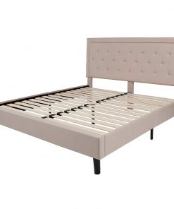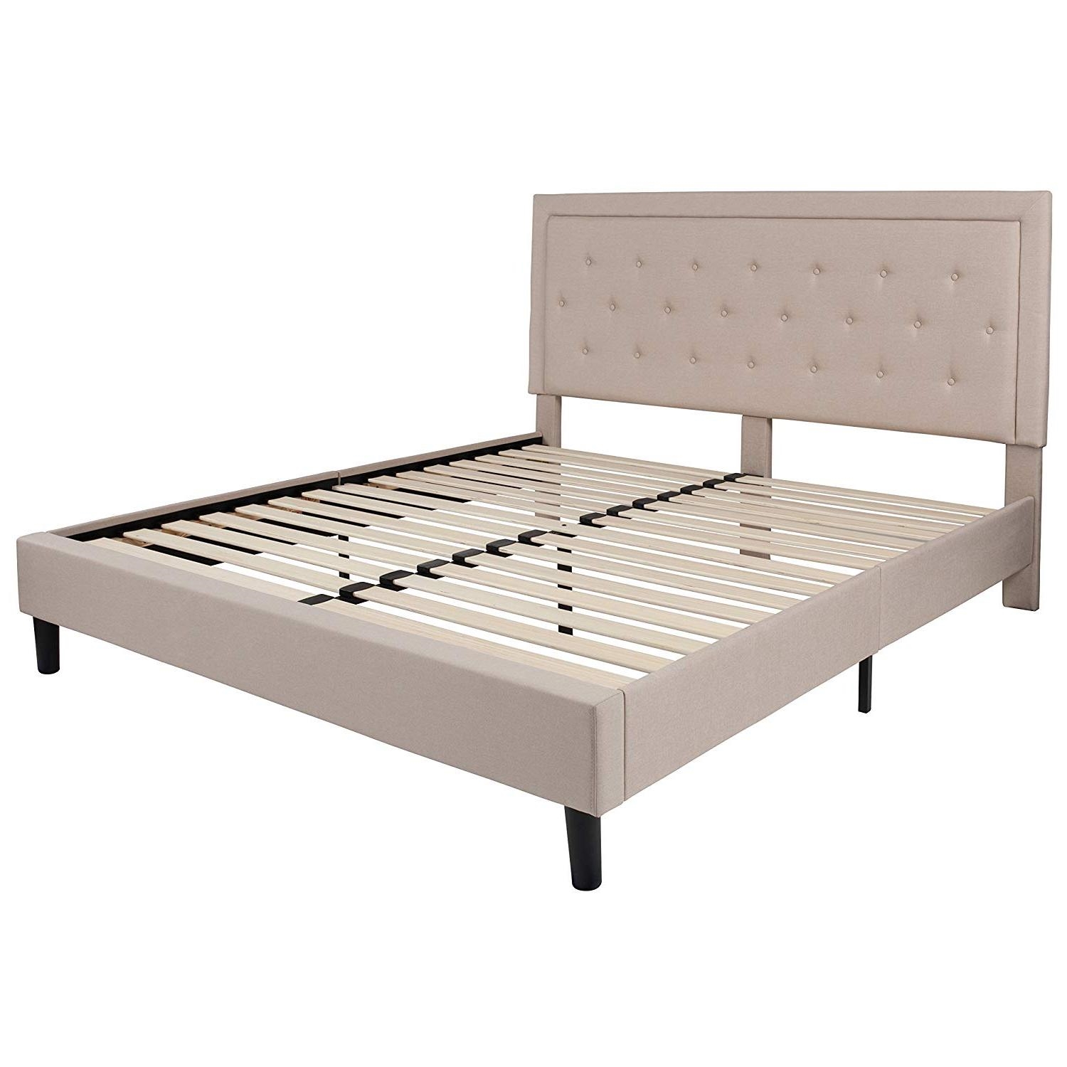 • King Beige Upholstered Platform Bed Frame with Button Tufted Headboard