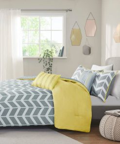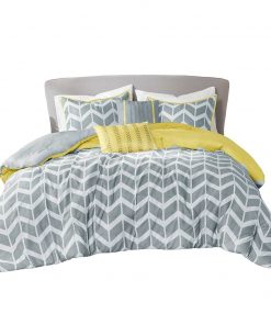 This King / Cal King Reversible Comforter Set in Grey White Yellow Chevron Stripe updates any bedroom into a fun and inviting space. This stylish comforter features a grey and white chevron print broken up by white vertical stripes and a solid purple at the top that pops! The 2 matching shams (1 in King) with a purple flange pairs perfectly with the delightful chevron pattern, while 2 decorative pillows in coordinating colors help complete the look. Made from ultra-soft microfiber, this comforter set is machine washable for easy care. This bedding set uses an antimicrobial treatment that provides built-in freshness protection, reducing the growth of odor causing bacteria to keep fabric lasting longer.