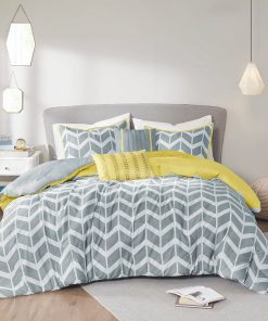 • King / Cal King Reversible Comforter Set in Grey White Yellow Chevron Stripe