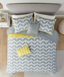 • Bright and inviting comforter set features grey chevron print broken up on white vertical stripe