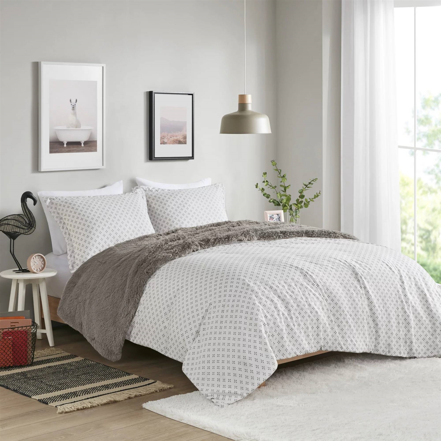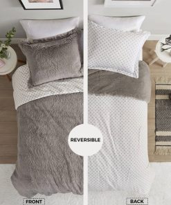 This King/CAL King size Grey Reversible Soft Sherpa Faux Fur 3-Piece Comforter Set is very soft and reversible to microfiber with beautiful petals print. It offers incredible 2 in 1 value for ultimate comfort. The reversible dual texture fabric is a perfect combination for all season comfort. You can use the faux fur side for colder season, and the print side for warmer. Now you can use your favorite cozy winter cover all year round! Available in different sizes to choose. For your convenience, it is also machine washable.