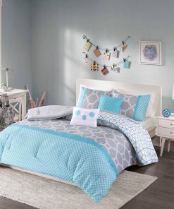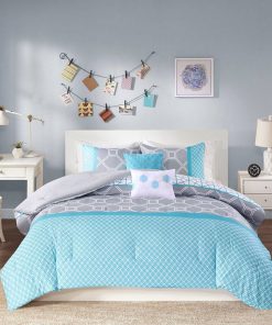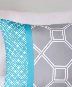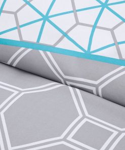 Invite a modern touch to your bedroom with the King / California King 5-Piece Teal Blue Grey White Geometric Comforter Set. The comforter displays various geometric motifs using a contemporary color palette of aqua and soft grey. Matching shams (1 in Twin/TwinXL) incorporate the same geometric motifs on the comforter to bring the bright colors and vibrant patterns to the head of the bed. Two decorative pillows, featuring embroidered hexagons, provide the finishing touches to complete this set. This bedding set also uses an antimicrobial treatment that provides built-in freshness protection, reducing the growth of odor causing bacteria to keep fabric lasting longer.