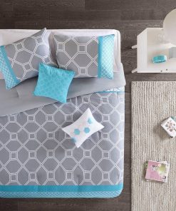 - King / California King 5-Piece Teal Blue Grey White Geometric Comforter Set