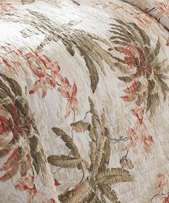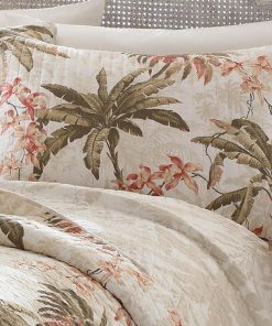 Escape to a tropical oasis by dressing your bed in the King Size Coastal Palm Tree 3 Piece Reversible Quilt Set. Soft coral, green, and white palm trees and tropical flowers grace one side. Tonal beige palm tree silhouettes on the reverse offer two looks in one. This bedding set includes a quilt and two pillow shams. Pieces are machine washable.