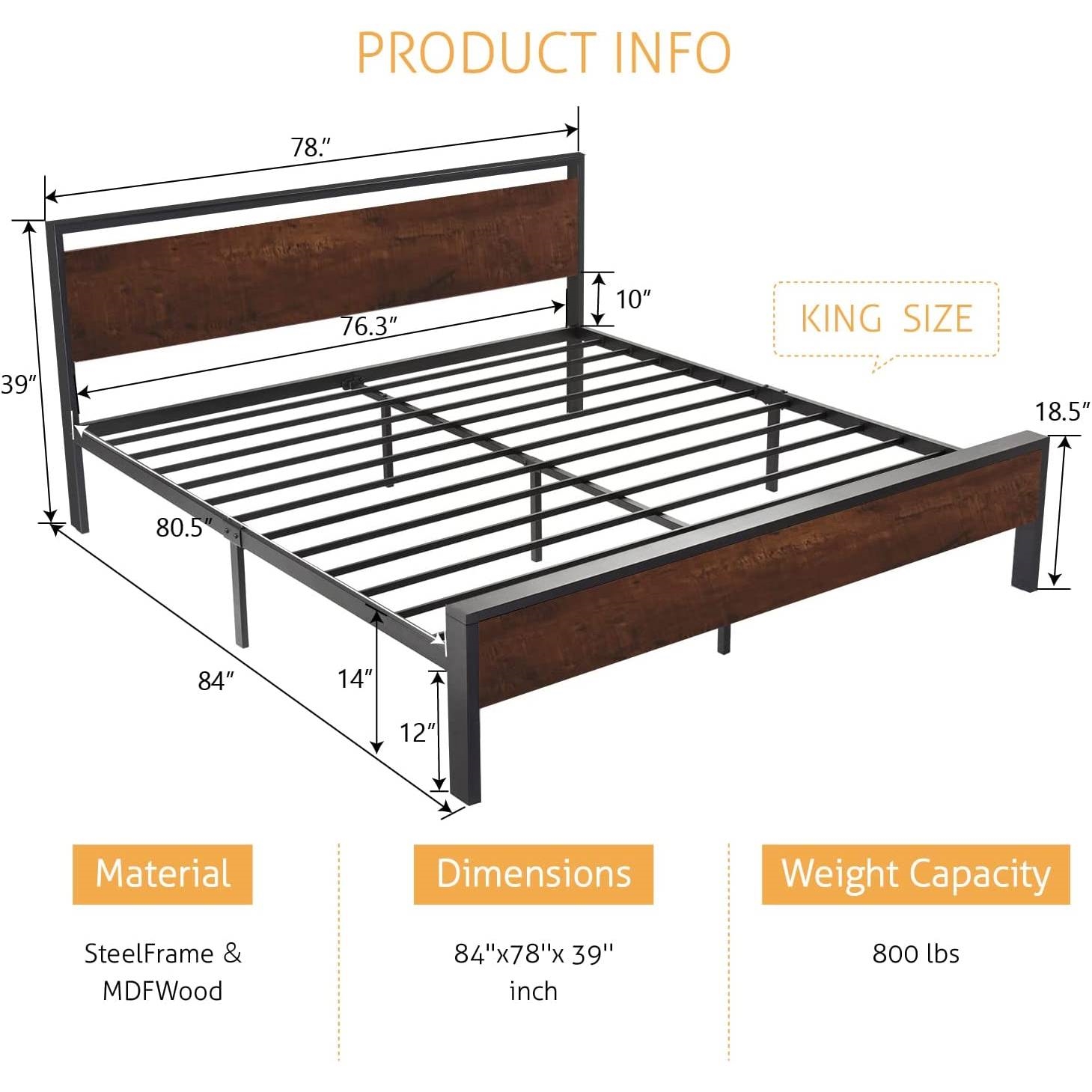 • King Metal Platform Bed Frame with Mahogany Wood Panel Headboard Footboard